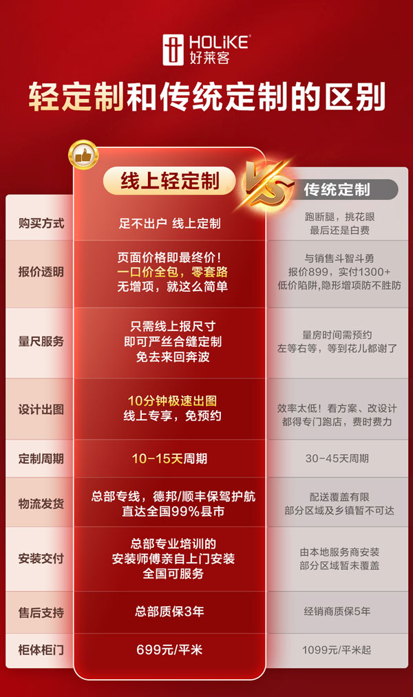 好莱客于2025年7月正式推出轻定制模式,将其定义为:极致的流程优化,缩短销售流程,具备单品零售价且能够B2C销售的板式柜类商品。实现「极致流程+短周期+透明化」的家居定制新模式。相比好莱客线下定制(专车服务)高端定制服务,轻定制(特惠快车)只满足家居定制的产品需求,让单件家具也能轻松完成私人定制。