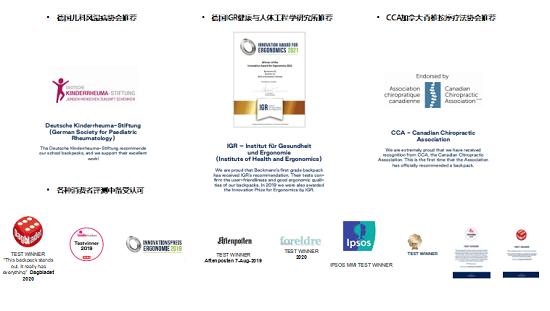 75年专业护脊书包经验,使得Beckmann贝克曼书包在欧洲享有“挪威国民书包”的美誉,在挪威本土有超过80%的市场占有率,更是成为孩子们“人生第一个书包”的首选,甚至深受挪威皇室公主的青睐。同时,Beckmann亦在德国IGR健康与人体工程学研究所、CCA加拿大脊椎按摩疗法协会等权威机构得到专业认可。