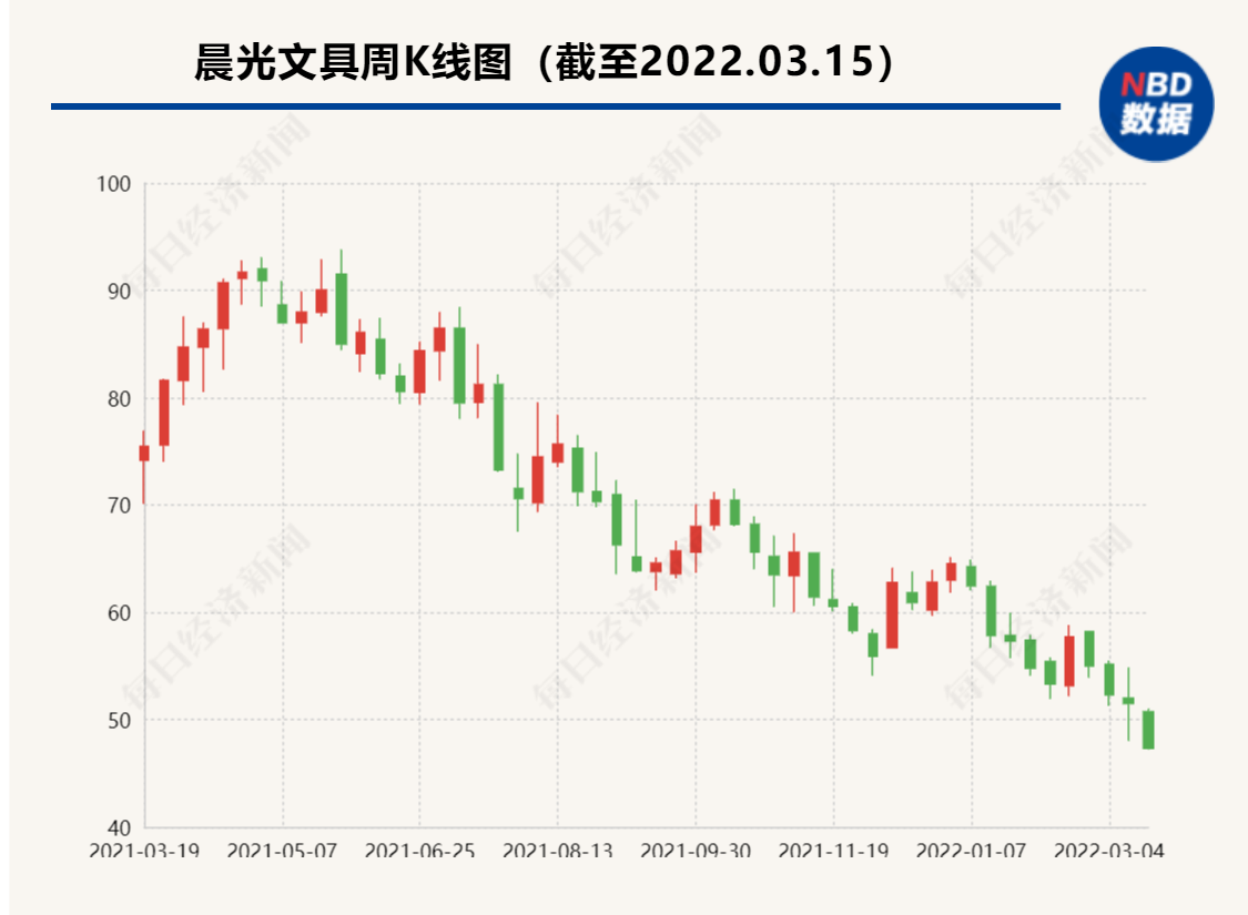 《每日经济新闻》注意到,晨光文具最新披露了2021年度业绩快报。数据显示,去年公司营业收入约176.07亿元,同比增加34.02%;归属于上市公司股东的净利润约15.18亿元,同比增加20.91%。净利润实现双位数增长,财务数据依旧亮眼,但在二级市场上,公司股价却跌跌不休。截至3月15日,晨光文具报收于47.3元/股,较2021年2月的百元高点已经跌超50%。