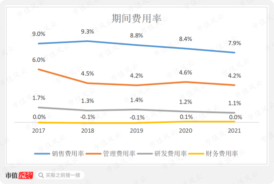 期间费用中,销售费用率和研发费用率形成较大反差,2021年分别为7.9%和1.1%。
