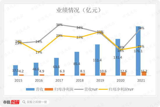 在2020年业绩增速下滑的基础上,2021年公司业绩增速有所回升,营收和归母净利润分别增长34%和21%,达到176.1亿和15.2亿。