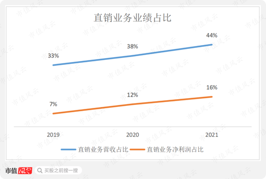 因此也造成直销业务营收占比较高的情况下,利润占比却较小。2021年直销业务营收和净利润占比分别为44%和16%。