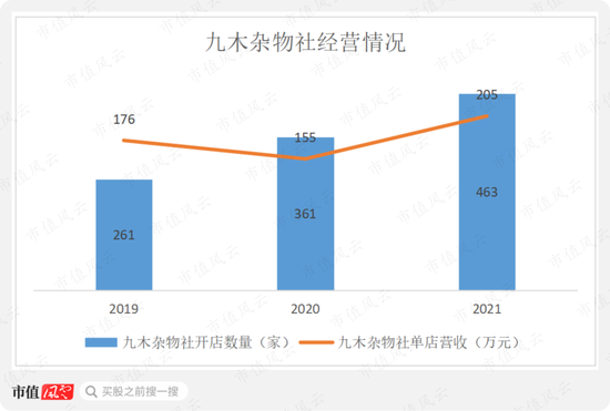 零售大店业务包括九木杂物社和晨光生活馆,其中九木杂物社营收占比在90%左右。在持续亏损的情况下,公司依旧不断增加开店数量,2019年-2021年九木杂物社大约每年新开店100家,已达463家。