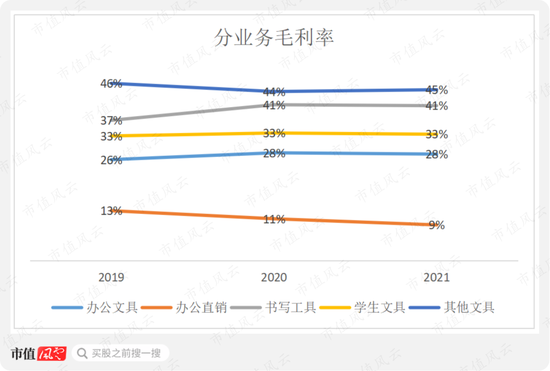 但直销业务毛利率相对较低,且呈下滑趋势,2019-2021年分别为13%、11%和9%,较其他业务低20个百分点左右。