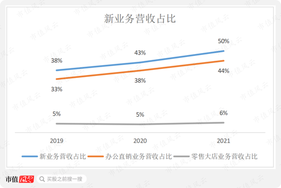 2019年-2021年,公司新业务营收占比已由38%上升至50%,达到一半,其中主要贡献来源为办公直销业务,零售大店业务一直在5%-6%之间。