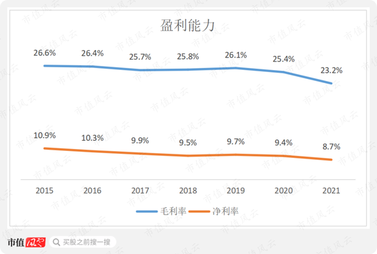 公司的利润率整体上较为稳定,但有缓慢下滑的趋势,2021年毛利率和净利率均为上市以来最低水平,分别为23.2%和8.7%,较2015年分别下滑了3.2和2.1个百分点。