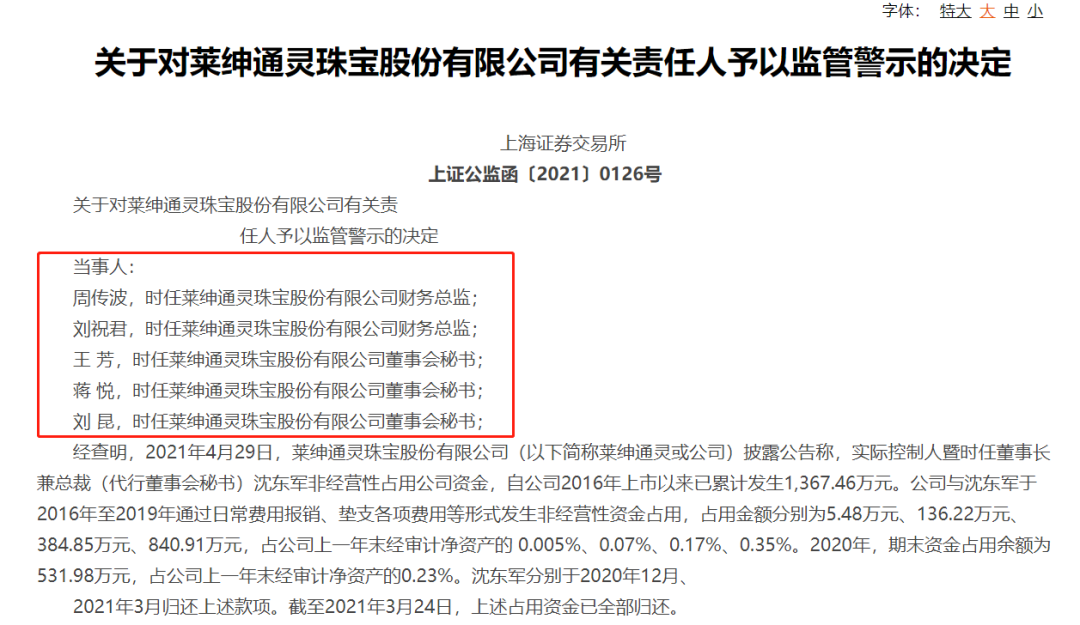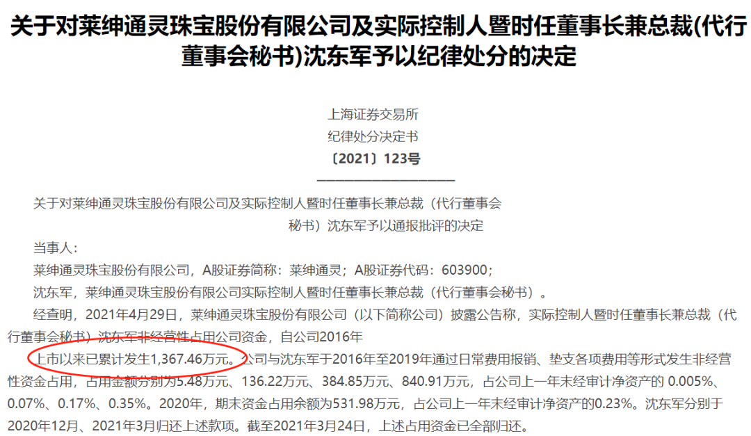 10月11日晚,莱绅通灵(603900)发布公告,公司实控人暨时任董事长沈东军因非经营性占用公司资金被上交所通报批评,其自公司2016年上市以来累计占用超千万的行为也被曝光。