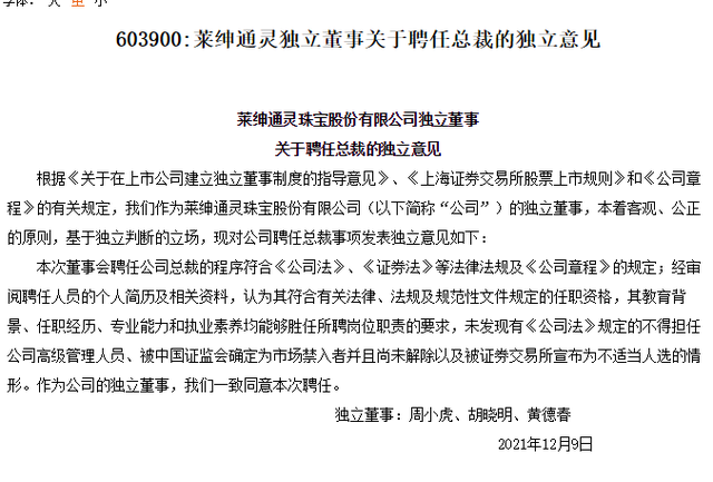 12月9日晚间,莱绅通灵披露公告称:董事会审议通过聘任Jacky Jiang为公司总裁的议案。随后,上交所向莱绅通灵下发监管工作函,就公司董事会相关事项明确监管要求,涉及对象包括上市公司、董事、监事、高级管理人员、一般股东、控股股东及实际控制人。