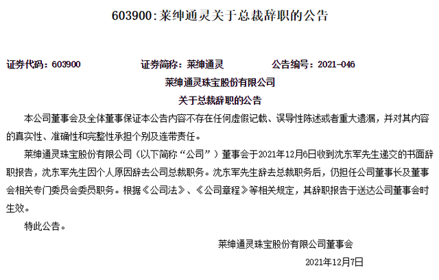 12月9日,也就是沈东军辞任总裁3天后,莱绅通灵召开了董事会。这场会议内容是审议新一任总裁的人选。作为董事长,沈东军提议聘任JackyJiang为总裁,任期至2024年1月7日。