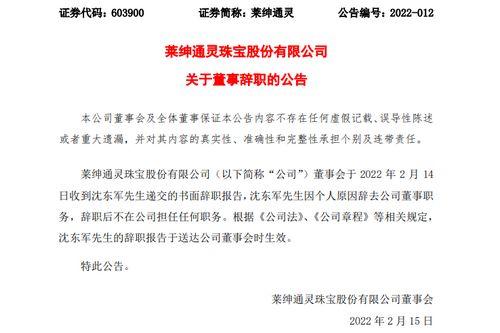 14日消息,莱绅通灵珠宝股份有限公司发布公告称,董事会于2022年2月14日收到沈东军递交的书面辞职报告。沈东军因个人原因辞去公司董事职务,辞职后不在公司担任任何职务。辞职报告于送达公司董事会时生效。