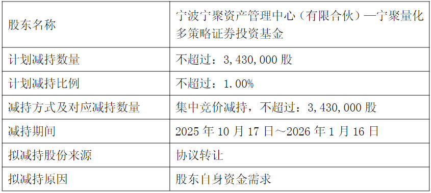 2025年9月17日晚间,莱绅通灵发布了持股5%以上股东减持股份计划公告。该公告显示,宁波宁聚直接持有公司股份1821.32万股,持股比例5.31%,其计划自2025年10月17日至2026年1月16日通过集中竞价交易方式减持公司股份不超过343万股,减持比例不超过1.00%,而减持原因为自身资金需求。