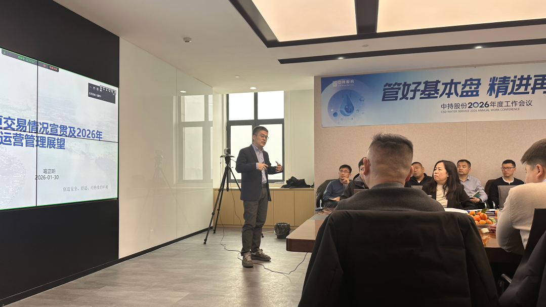 中持股份副总经理喻正昕在会议上系统阐述了公司经营管理的新变化,并结合行业形势进行分析研判,明确提出以“消风险、保现金、提效率、促AI”为核心的运营管理思路,围绕着运营水质达标、安全生产管理、厂站稳定运行等重点领域,会议进一步明确了2026年公司各运营项目的工作方向和管理重点。
