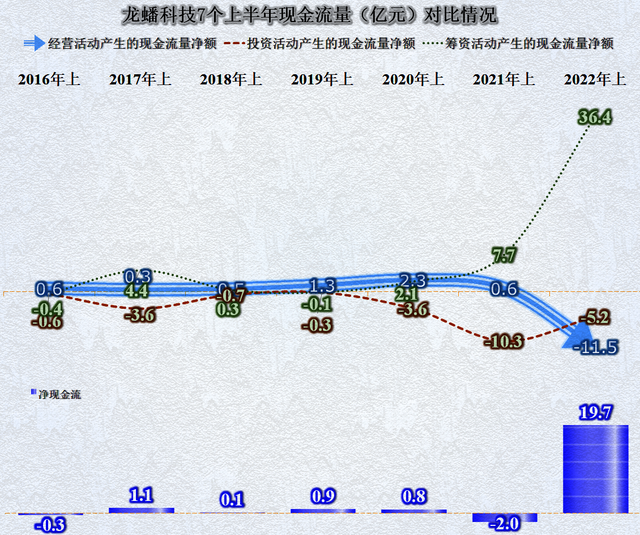 存货大幅增长,应收类款项也大幅增长,我们就猜到了,其现金流量表现可能不太好,确实如此,2022年上半年,龙蟠科技经营活动的净现金为净流出11.5亿元,这是其有公开数据来的首次净流出。通过融资来解决了这些缺口,预计年底可能会缩小,甚至会转正,毕竟新业务也不可能一直需要垫入如此多的资金。但是,市场是变化的,下半年的行业情况,其实谁也说不准。