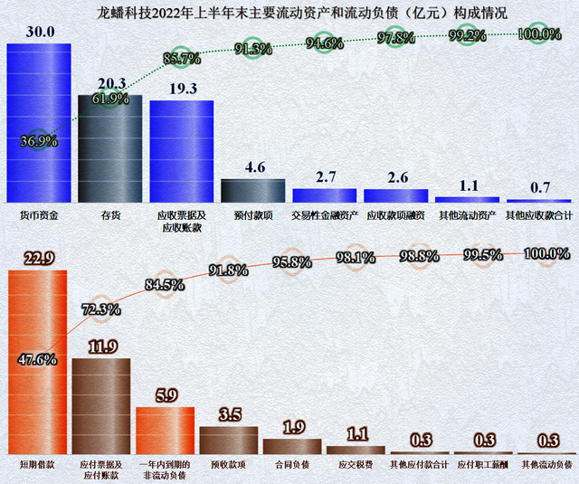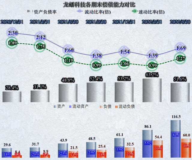 一直以来,龙蟠科技的偿债能力都不错,2022年上半年末还比年初有所提升,这就是有较大盈利带来的好处。其资产负债规模也在迅速膨胀,半年时间,资产差不多增长了一倍,当然负债也有差不多幅度的增长。