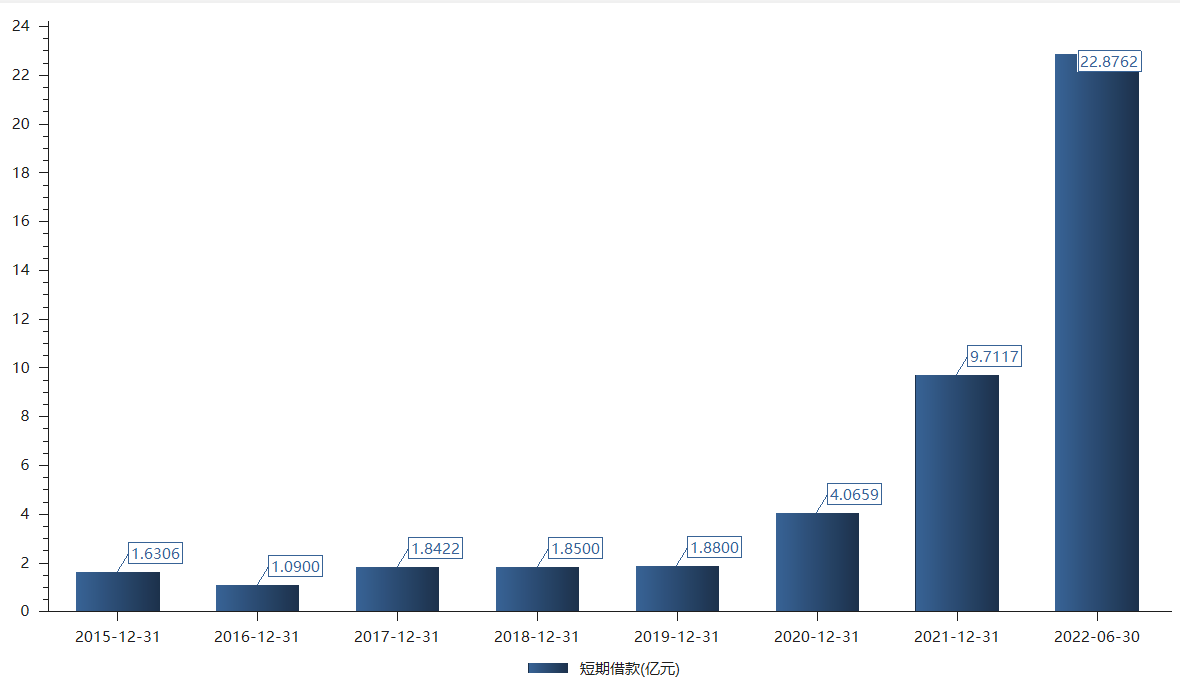 2022年5月30日龙蟠科技完成22亿元的定增增资,同时今年上半年公司大幅举借外债,取得借款超24亿元。从今年年初到6月末,半年时间内公司短期借款由9.7亿元涨至22.88亿元,涨幅136%。