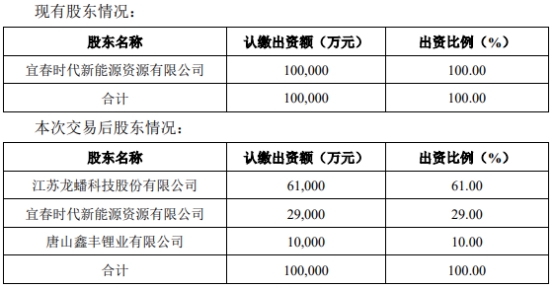 龙蟠科技、唐山鑫丰锂业和宜春时代拟就年产3万吨碳酸锂项目开展合作,该项目将由合资公司负责具体实施。为此,龙蟠科技与唐山鑫丰锂业同意按照协议约定的条款与条件,受让宜春时代合计持有的合资公司71%的股权。其中,龙蟠科技以人民币1元的价格受让宜春时代持有的合资公司61%的股权(对应认缴注册资本为人民币61,000万元);唐山鑫丰锂业以人民币1元的价格受让宜春时代持有的合资公司10%的股权(对应认缴注册资本为人民币10,000万元)。