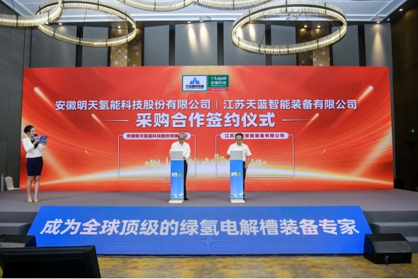 此外,活动中,龙蟠科技天蓝智能装备公司还与国内领先的燃料电池企业——安徽明天氢能科技股份有限公司举行了采购意向协议签约,明天氢能将会把天蓝公司作为后续电解槽采购的优先供方,双方将借此契机,进一步深化合作交流关系,携手齐心,共同推动绿氢产业在各领域规模化、高质量发展。