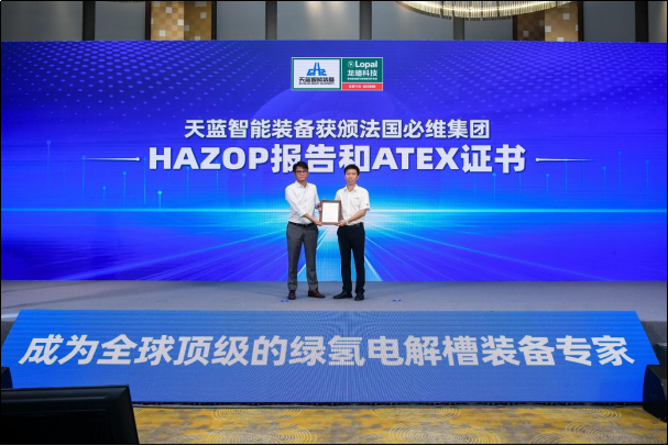 产品的质量与安全是龙蟠科技发展的“生命线”,龙蟠对于产品的安全性有着严苛的标准。仪式上,法国必维国际检验集团为“天蓝1号”颁发了HAZOP报告和ATEX证书。必维国际检验集团成立于1828年,是全球知名的国际检验、认证集团,也是行业内获得世界各国政府和国际组织认可最多的机构之一,能获得必维公司的认证,意味着“天蓝1号”首台套电解槽设备的各项性能指标已经达到了世界一流水准。
