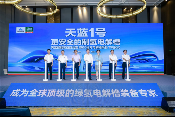 ”作为设备研发过程中的重中之重,本次下线的天蓝1号1000标方首台套设备,目前已通过法国必维国际检验集团HAZOP分析和安全仪表系统SIL评估认证、欧盟ATEX防爆认证。在生产工艺方面,"天蓝1号"采用半自动生产线,提高了产品的稳定性、一致性,同时还在电解槽结构、气液分离器结构、碱液循环系统工艺等方面进行了改良升级,采用新型电极喷涂工艺,搭载新一代隔膜,极大地提升了电解槽使用寿命、提高了制氢效率、降低了制氢成本,在电解水制氢设备的安全性、绿色性和经济性等方面均实现了较大突破。