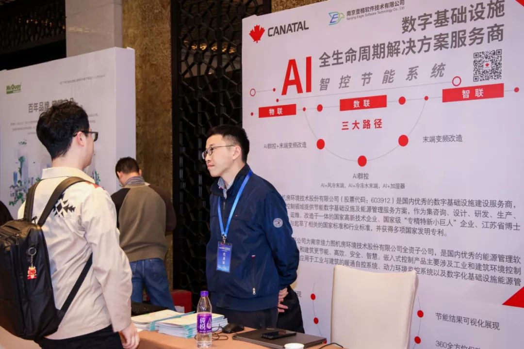 论坛现场,南京佳力图机房环境技术股份有限公司作为数字基础设施全生命周期解决方案服务商展示我司的AI智控节能系统。展示内容包括整体解决方案介绍、优势亮点、能源管理、负荷响应能耗优化、安全保障措施、案例。