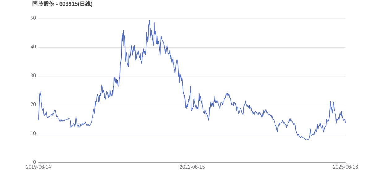 2021年8月11日,国茂股份的市值巅峰达到236.24亿元,股价也顺应升至50.0元。而至6月13日收盘,国茂股份的股价为13.83元,市值为91.15亿元,相比峰值时期市值减少145.09亿元,市值蒸发了61.42%。