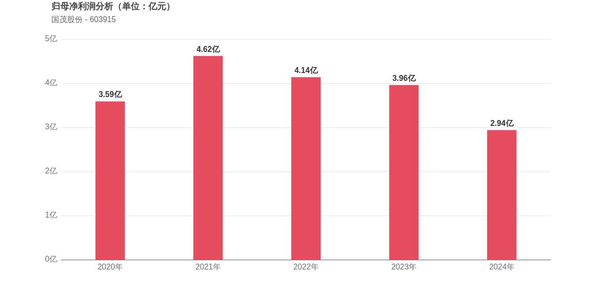 利润角度分析,2020年国茂股份实现归母净利润3.59亿元,2024年2.94亿元。公司归母净利润在经历2020年、2021年连续增长后,自2022年起连续三年下滑。