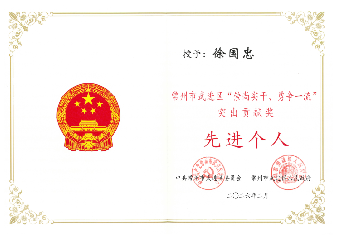 2月6日,在武进区现代化产业高质量发展大会上,国茂股份荣获常州市武进区 “崇尚实干、勇争一流”突出贡献奖先进集体(地方税收突出贡献企业)称号,徐国忠董事长获评常州市武进区“崇尚实干、勇争一流”突出贡献奖先进个人。