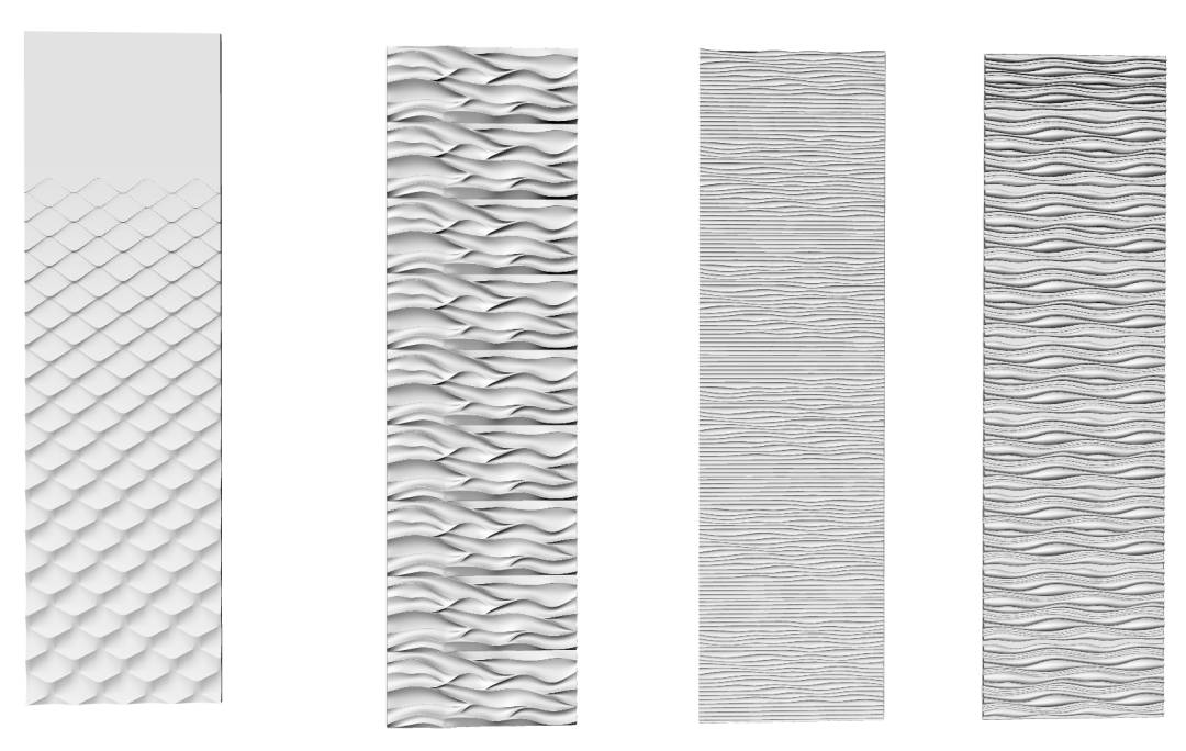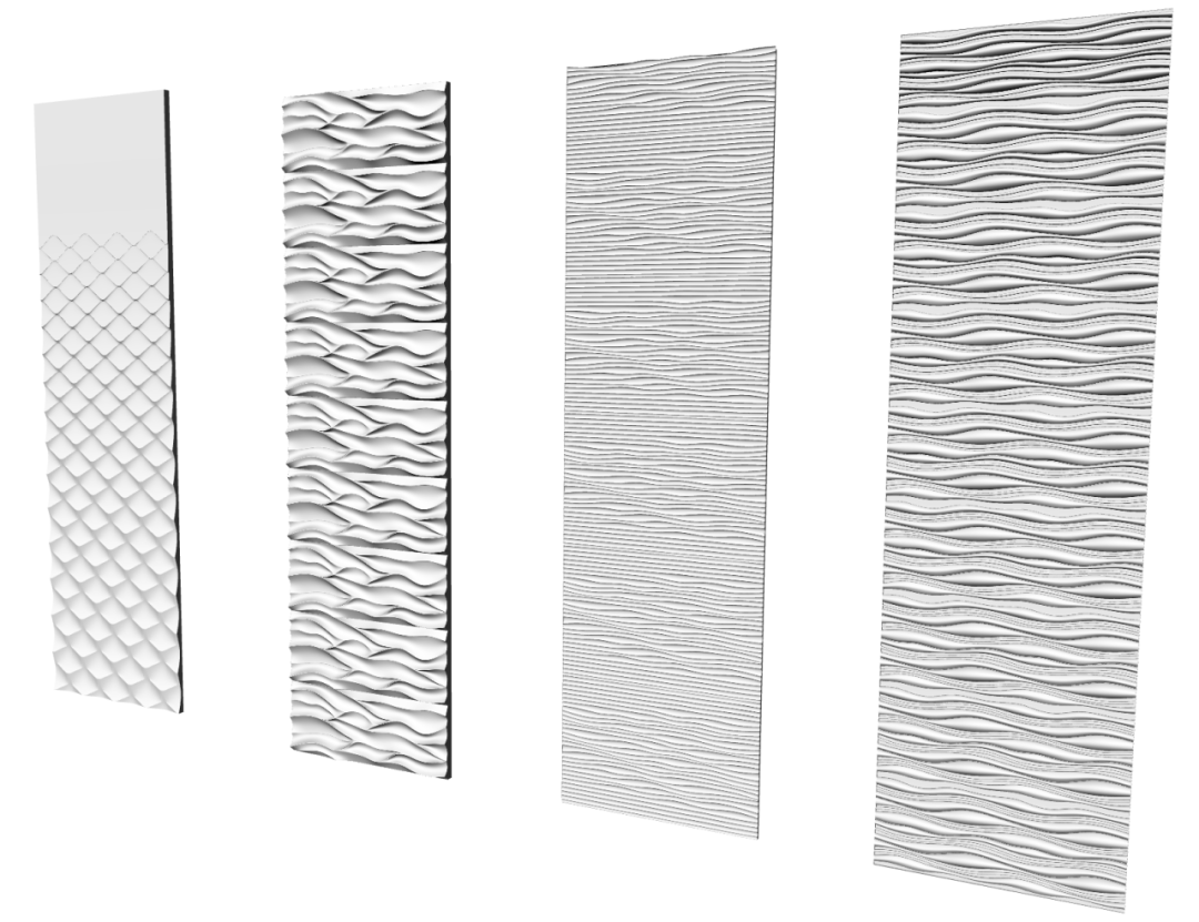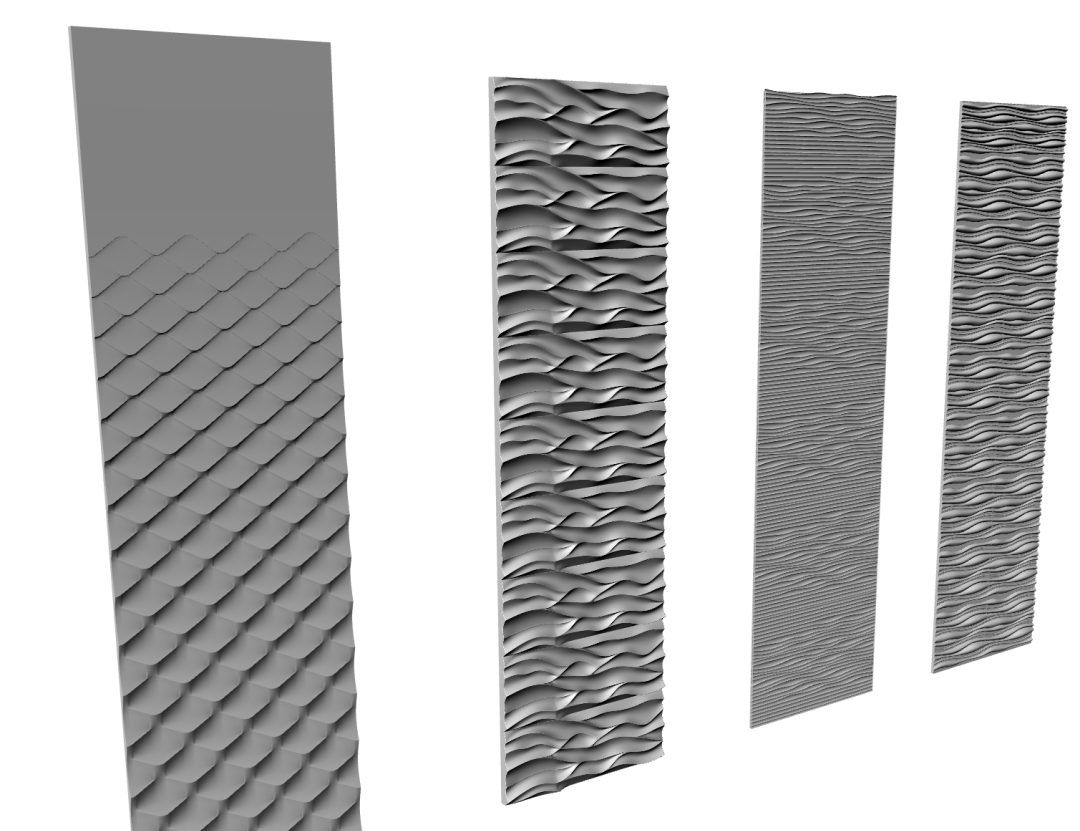 最终方案为浅灰色的渐变鱼鳞片造型,此造型具有立体感强、渐变路径灵动、正视及侧视时光影变幻、不容易积聚浮灰等特点。