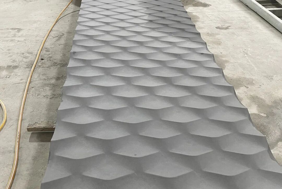 相对常规石材,本项目既展示了UHPC制品尺度上的优势;同时,通过数字建模、CNC雕刻翻模、UHPC浇筑成型,又创造了现实世界中并不存在的几何图形,突破了造型的限制,构建了UHPC制品制作流程新范式。表面的磨砂效果,不但形成了视觉上的高级感,而且辅以优质透明防护剂,赋予UHPC制品优异的防污效果,降低了后续维护清洁成本。