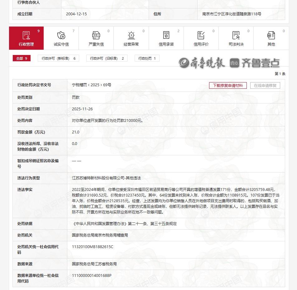 齐鲁晚报·齐鲁壹点记者从信用中国获悉,江苏苏博特新材料股份有限公司(苏博特 603916.SH)因虚开发票的行为,被国家税务总局南京市税务局稽查局罚款210000元。