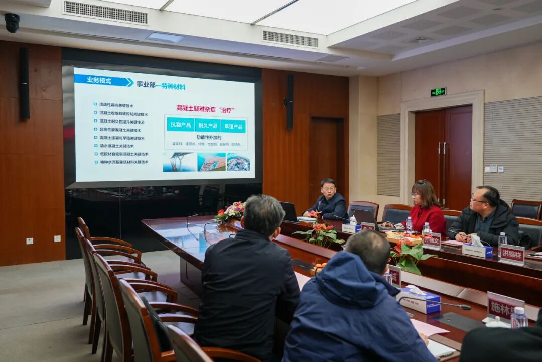 座谈会上,洪锦祥总经理围绕苏博特的产品业务与工程实践作了系统介绍,详细阐述了公司在科技创新体系构建、产业链协同布局以及服务国家重大工程等方面的进展与规划。