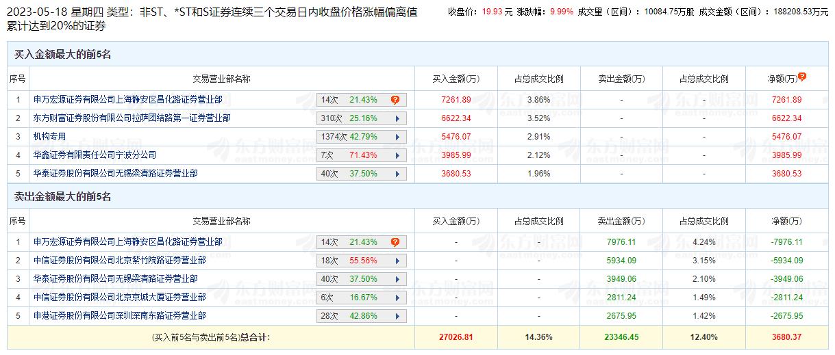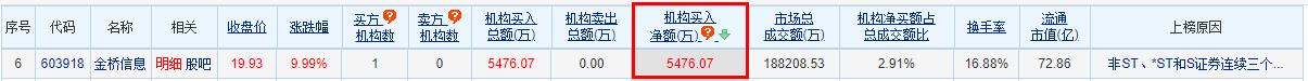龙虎榜数据显示,作为非ST、*ST和S证券连续三个交易日内收盘价格涨幅偏离值累计达到20%的证券,买入金桥信息金额最大的前五名中,有1家机构专用席位。经统计,金桥信息的机构席位三个交易日净买入金额为5476.07万元。