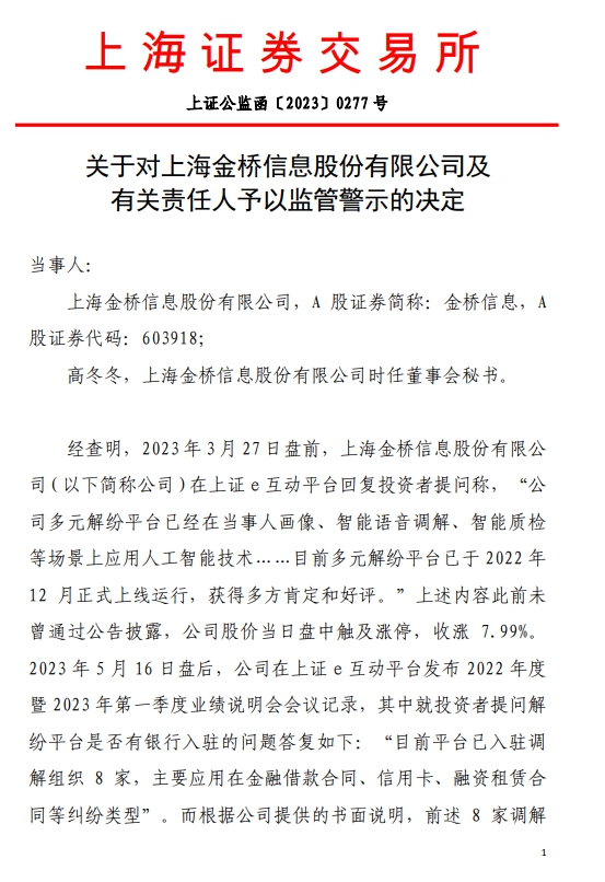 上交所表示,经查明,2023年3月27日盘前,金桥信息在上证e互动平台回复投资者提问称,“公司多元解纷平台已经在当事人画像、智能语音调解、智能质检等场景上应用人工智能技术……目前多元解纷平台已于2022年12月正式上线运行,获得多方肯定和好评。”上述内容此前未曾通过公告披露,公司股价当日盘中触及涨停,收涨7.99%。
