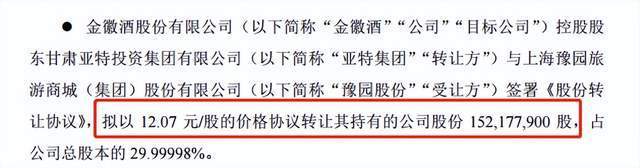 金徽酒和豫园股份的缘分,发生在2020年5月,亚特集团与豫园股份签署《股份转让协议》,以12.07元/股的价格协议转让其持有的公司股份1.52亿股,占总股本30%,交易金额为18.37亿元。