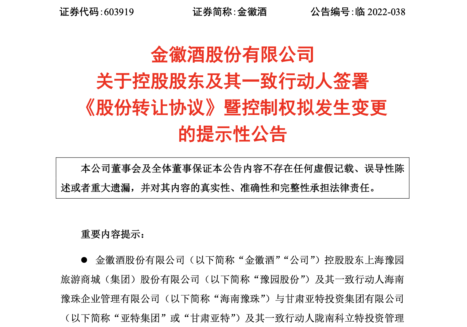 金徽酒在公告中指出,公司控股股东豫园股份及其一致行动人海南豫珠与亚特集团及其一致行动人陇南科立特分别签署《股份转让协议》,海南豫珠向亚特集团转让其持有的金徽酒8%股份、豫园股份向陇南科立特转让其持有的金徽酒5%股份,转让价格均为29.38元/股。转让完成后,亚特集团及其一致行动人陇南科立特合计持有公司26.57%股份,公司控股股东将由豫园股份变更为亚特集团。