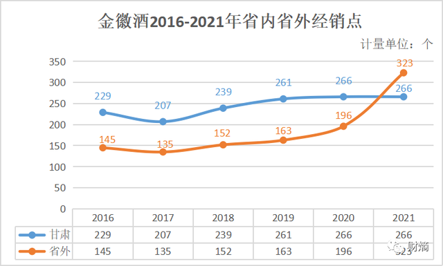 2016年至2021年,金徽酒总经销商数量分别为374个、342个、391个、424个、462个、589个,其中甘肃地区的经销商数量分别为229个、207个、239个、261个、266个、266个,其他地区的经销商数量分别为145个、135个、152个、163个、196个、323个。