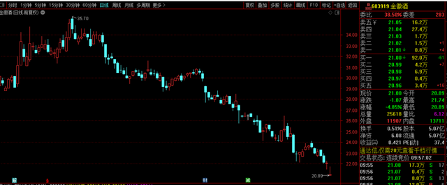 10月26日,金徽酒开盘大跌,盘中最大跌幅逾5%,截止发稿时,金徽酒依然大跌4%,股价报于21元左右,总市值触106亿。