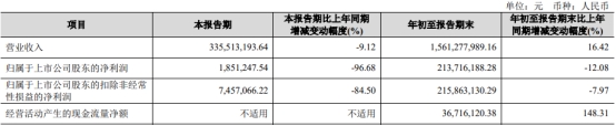 今年第三季度,金徽酒实现营业收入3.36亿元,同比减少9.12%;归属于上市公司股东的净利润185.12万元,同比减少96.68%;归属于上市公司股东的扣除非经常性损益的净利润745.71万元,同比减少84.50%。
