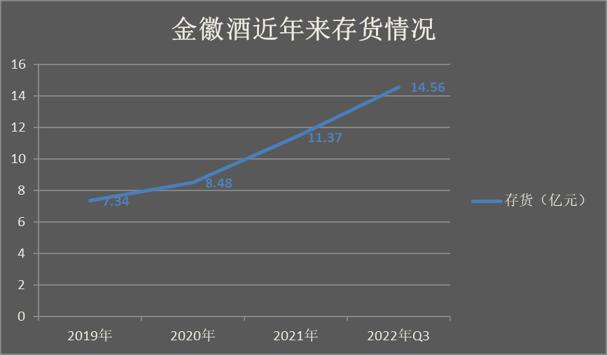 另一面,2019-2021年,金徽酒存货余额分别为7.34亿元、8.48亿元、11.37亿元。今年三季度存货再破纪录,高达14.56亿元。存货与销售费用持续增长,这所释放出的信息并无积极意义。