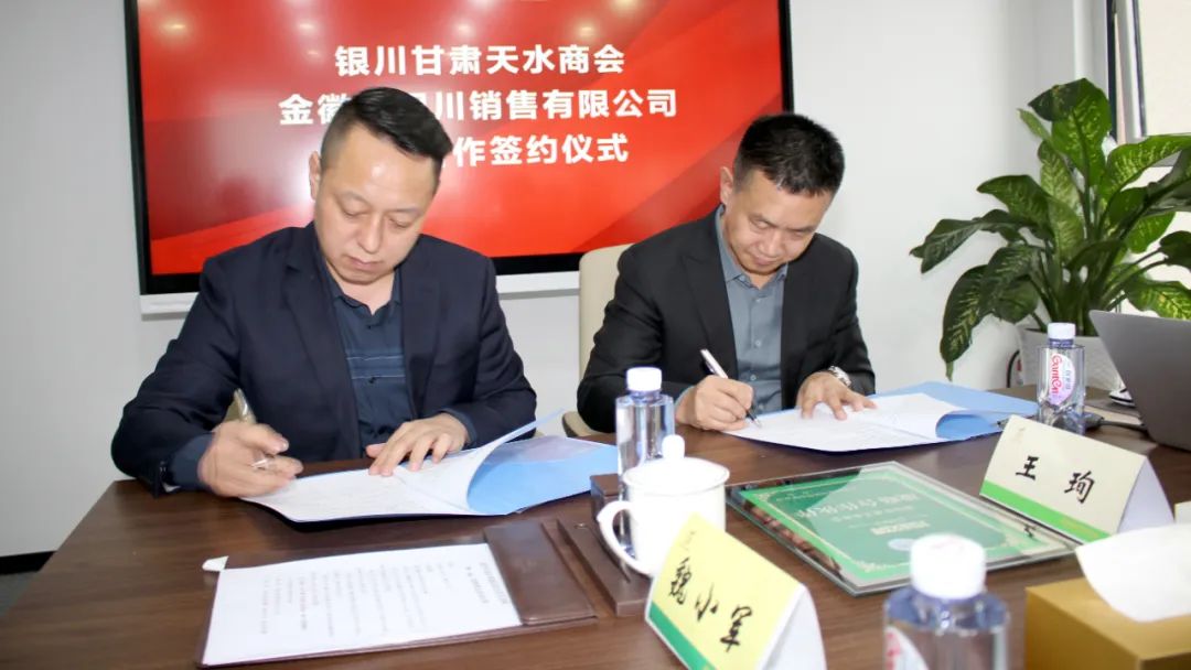 随后,金徽酒银川销售有限公司总经理徐文海与银川天水商会会长成天赐共同签署战略合作协议并授牌。当晚,还举行了答谢晚宴。