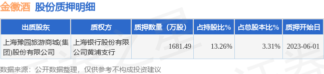 金徽酒(603919)6月2日公开信息显示,股东上海豫园旅游商城(集团)股份有限公司向上海银行(601229)股份有限公司黄浦支行合计质押1681.49万股,占总股本3.31%。质押详情见下表: