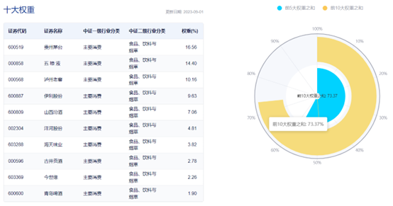 数据显示,截至2023年9月1日,该指数前十大权重股分别为贵州茅台、五粮液、泸州老窖、伊利股份、山西汾酒等,前十大权重股集中度为73.37%。