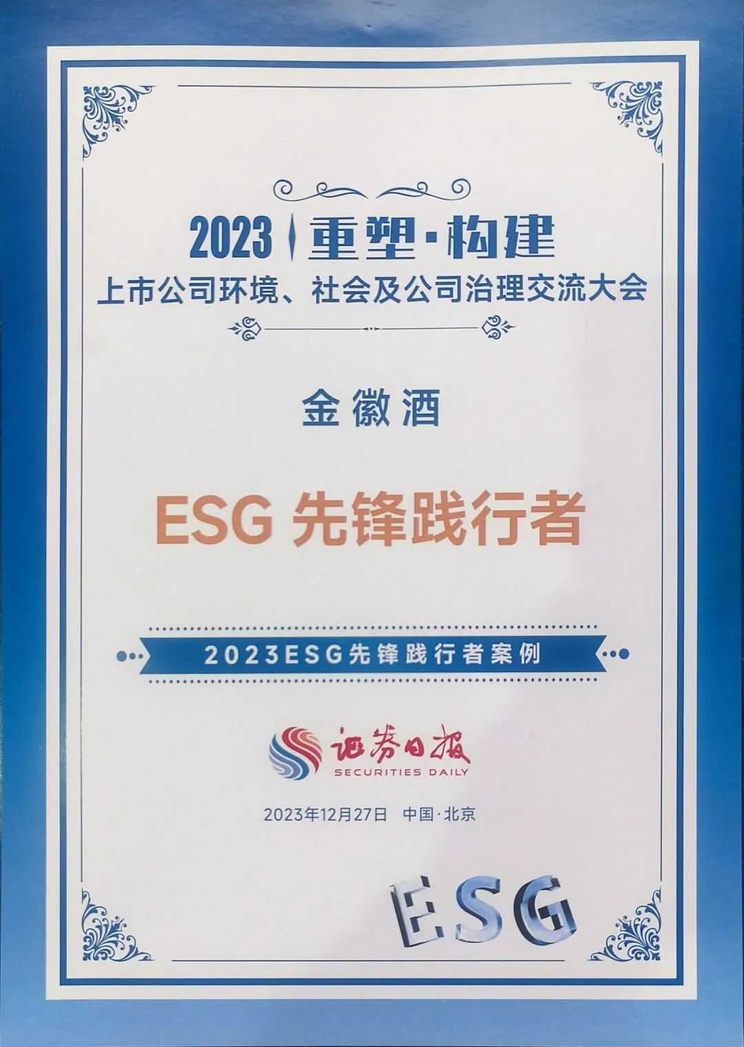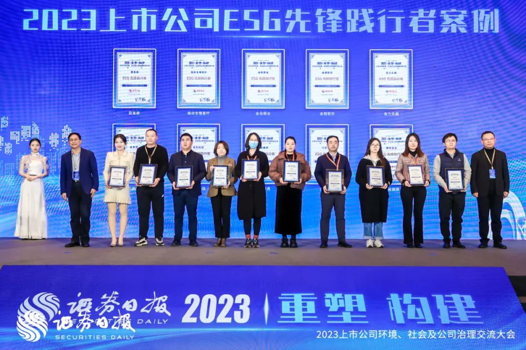 12月27日,“2023上市公司环境、社会及公司治理交流大会”在首都北京举办,本次论坛以“重塑·构建”为主题,旨在重塑企业价值,构建中国特色ESG生态体系,为ESG发展提供有益的思想和实践借鉴。论坛上主办方对在ESG领域表现优异的企业颁发了奖项,金徽酒凭借在履行社会责任、践行ESG理念等方面的突出表现荣获“2023上市公司ESG先锋践行者”。