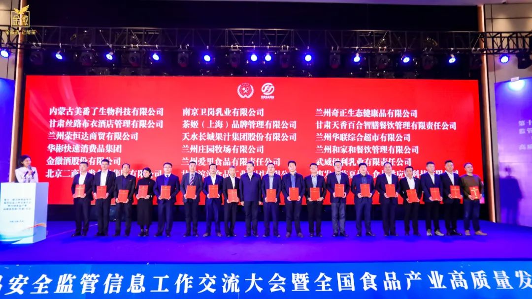 11月3日-4日,十一届全国食品安全监管信息工作交流大会暨全国食品产业高质量发展(甘肃)大会在兰州召开。甘肃省市场监管局党组成员、副局长冯继波,中国食品工业协会副会长、中国食品安全报社社长朱长学,金徽酒股份有限公司(以下简称:金徽酒)董事长周志刚及行业专家、企业代表汇聚一堂、把脉问诊,为食品产业高质量发展建言献策。金徽酒申报的《食品安全强基助乡村振兴》案例荣获大会“落实食品安全主体责任助力乡村振兴”优秀案例。