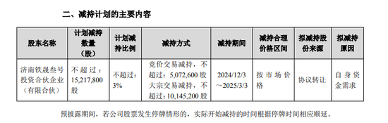 11月11日晚间,金徽酒发布公告,持有公司5%股份的第四大股东-济南铁晟叁号投资合伙企业(有限合伙)(下称“铁晟叁号”)宣布,计划通过集中竞价或大宗交易方式减持公司最多1522万股股份,占比为3%。