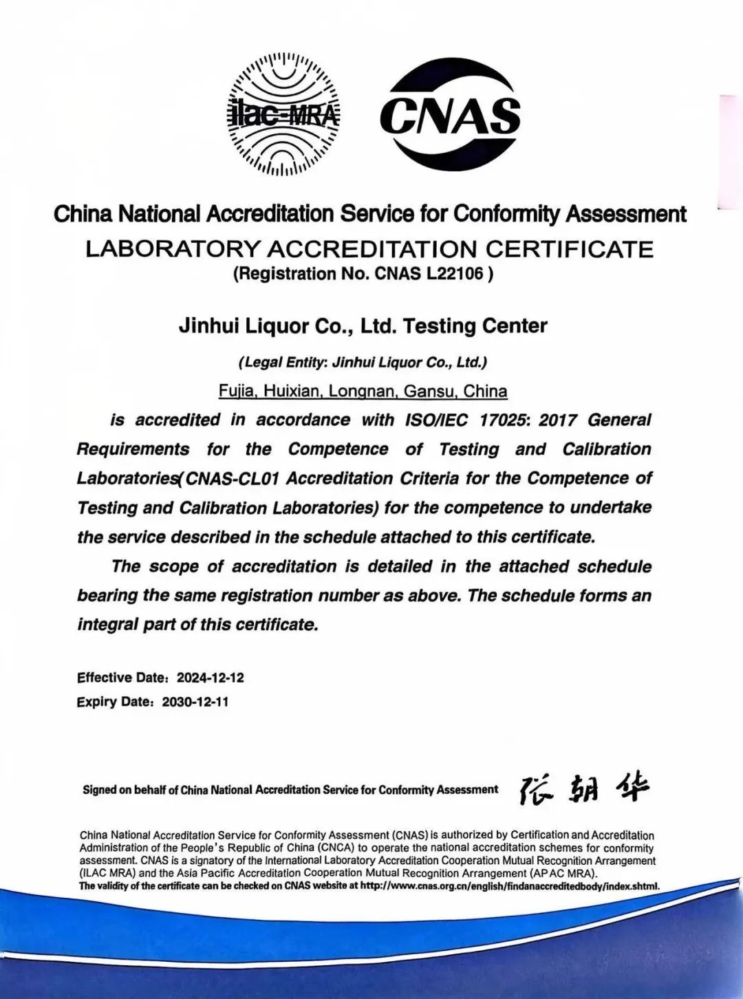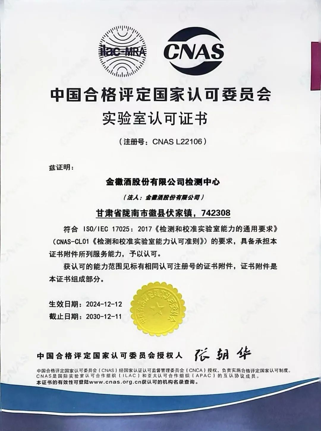 近日,金徽酒股份有限公司检测中心顺利通过中国合格评定国家认可委员会(China National Accreditation Service for Conformity Assessment,CNAS)认可评审,并获得其授予的实验室认可证书(注册号CNAS L22106)。该证书的获得标志着检测中心具备国际认可的管理水平和检测技术能力,实验室运行符合国际标准ISO/IEC 17025:2017《检测和校准实验室能力的通用要求》。
