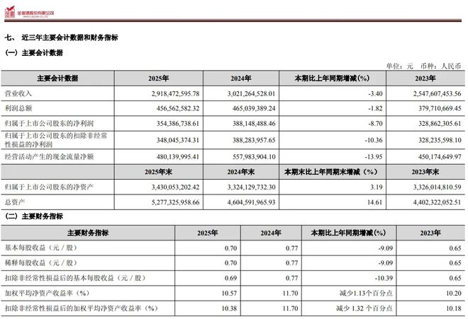 对于金徽酒而言,2025年无疑是“至暗一年”。财报数据显示,公司全年实现营收29.18亿元,同比下滑3.4%,归母净利润3.54亿元,同比下滑8.7%,这是其上市以来首次出现营收、净利润同步下滑的尴尬局面,彻底终结了此前的增长态势。