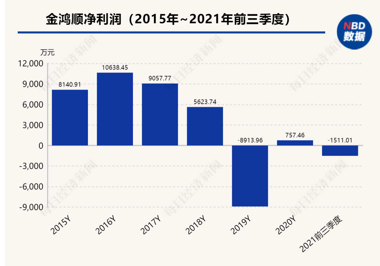 从2019年开始,金鸿顺业绩转亏,2019年度、2020年度以及2021年前三季度,金鸿顺累计亏损达9667.5万元,这一数字已超过2017年全年净利润。
