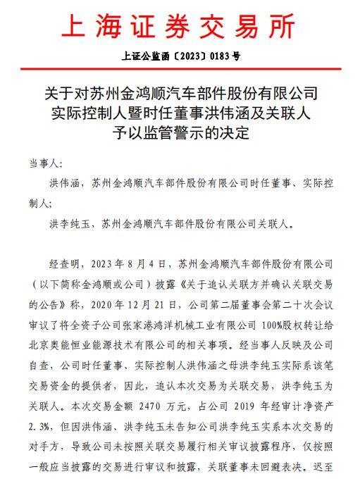 鉴于上述违规事实和情节,根据《股票上市规则》第16.1条和《上交所纪律处分和监管措施实施办法》等有关规定,上交所对苏州金鸿顺汽车部件股份有限公司时任董事、实际控制人洪伟涵,关联人洪李纯玉予以监管警示。