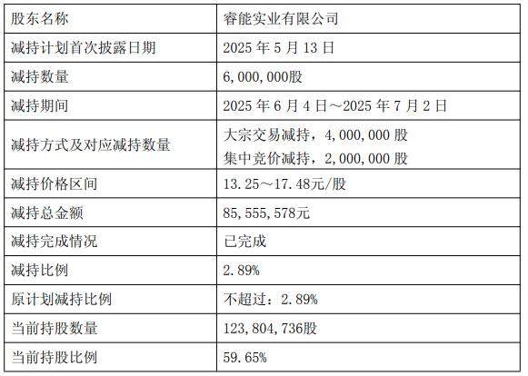 公告显示,2025年6月4日至2025年7月2日,睿能实业减持6,000,000股,减持价格区间13.25元/股至17.48元/股,减持总金额85,555,578元。